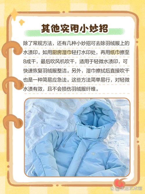 〖Two〗、使用白醋:将白醋与水按1:1的比例混合,用软布蘸取混合液,轻轻擦拭印记处。白醋有助于去除残留的洗涤剂或污渍,同时不会损伤羽绒服的面料。使用酒精:对于顽固的印记,可以尝试使用医用酒精进行局部处理。同样地,用软布蘸取酒精,轻轻擦拭印记处,然后彻底晾干。