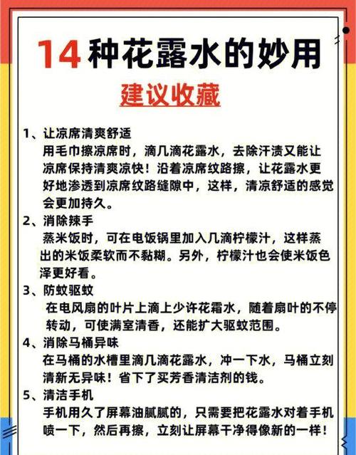 花露水主要由花露油与酒精调制而成,其成分包括橙花油、玫瑰香叶油、柠檬油等,这些成分赋予了花露水杀菌止痒、消除汗臭及防痱的功效。实际上,花露水对于治疗痘痘确实具有一定的效果。这得益于其内含的清热解毒与消肿止痛成分,能有效除菌杀菌。