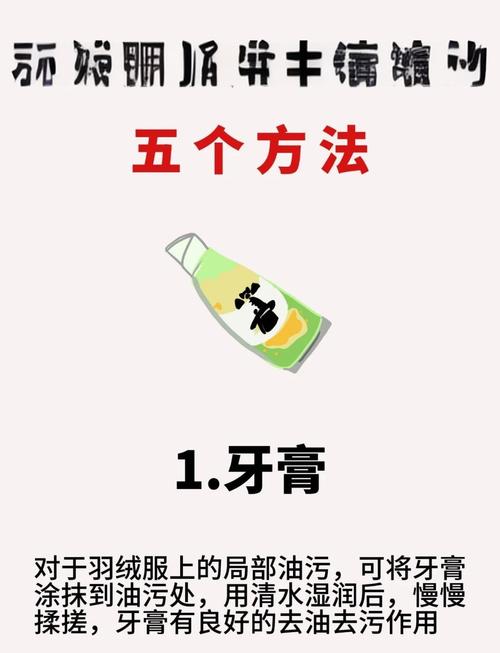 温水浸湿:先用温水将羽绒服上沾有油渍的部分浸湿,注意水温不宜过高,以免损伤羽绒。涂抹牙膏:在油渍处挤上适量的牙膏,牙膏中的摩擦剂和清洁剂有助于去除油渍。加入洗衣粉:在涂抹牙膏的基础上,撒上少量的洗衣粉,洗衣粉中的表面活性剂能够增强去污效果。