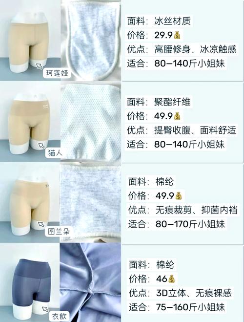 〖One〗、材质:尽量选取透气性好的材质,如棉质,穿着舒适且吸汗,能避免闷热感。丝绸材质的安全裤较为光滑,触感好,但费用可能较高。 款式:有平角、三角等款式。平角安全裤防走光效果好,适合穿短裙时;三角安全裤贴合度高,搭配紧身裤时较合适。 颜色:根据日常穿着衣物颜色选取,肤色安全裤百搭,深色安全裤适合搭配深色裙子或裤子。
