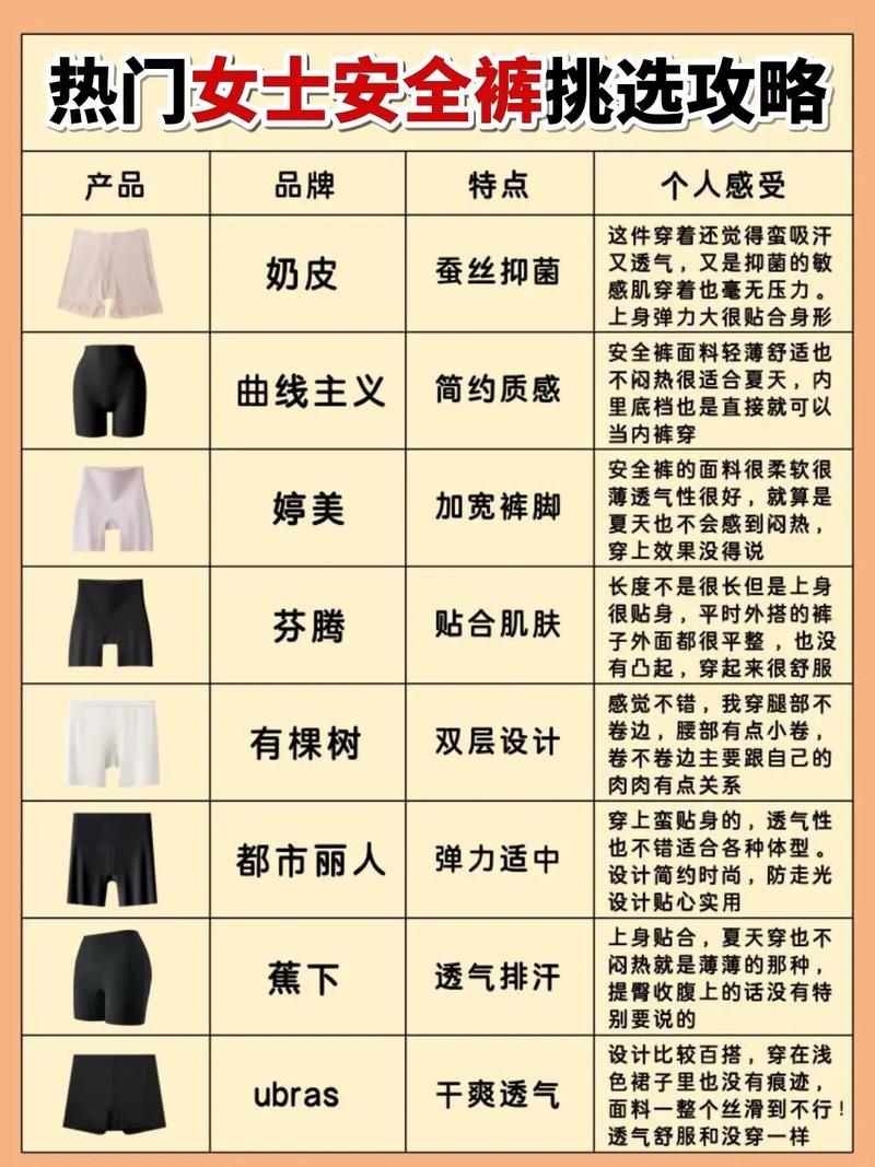 〖Five〗、选购安全裤时,需综合多方面因素来挑选合适的产品。材质方面,尽量选取透气性好的面料,如棉质,穿着舒适且能减少闷热感和不适感;而有弹性的面料,能更好贴合身体,活动自如。长度上,根据裙子长度来选。短裙搭配较长的安全裤,避免走光;长裙可选稍短的款式。