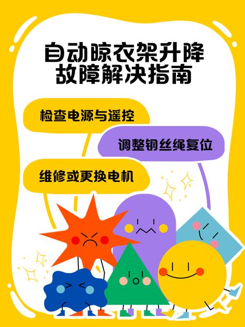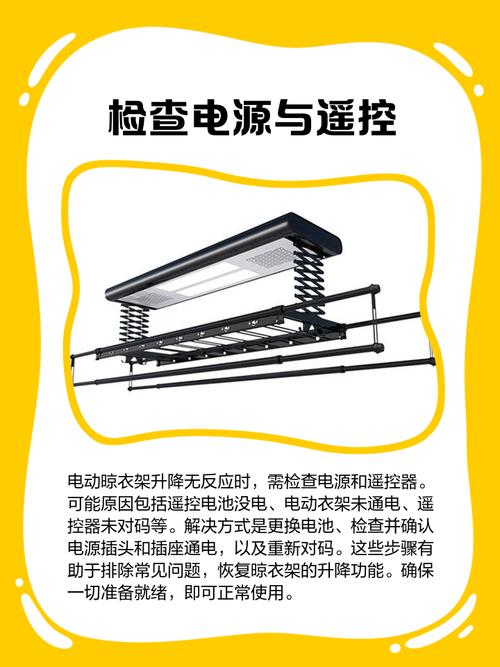 解决方法:检查电源和连接:首先,确保电动晾衣架的电源连接正常,没有松动或脱落。如果使用遥控器,尝试更换遥控器电池,看是否能解决问题。重启系统:对于电动晾衣架,可以尝试断电重启。同时按住遥控器的下降键和电源键5秒钟,进行强制复位。