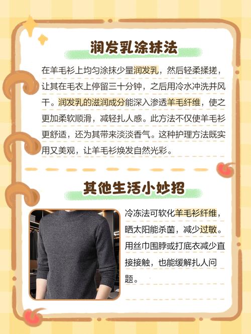 〖Five〗、如果羊毛衫穿着感到刺痒,可以尝试以下几种方法来解决:使用白醋处理:步骤:先将冷水和几茶勺的白醋混合,然后将羊毛衫内外反转放入混合液中,确保羊毛衫完全渗透,之后沥干水份。原理:白醋有助于软化羊毛衫的纤维,减少其对皮肤的刺激。护发素处理法:步骤:将护发素均匀涂在羊毛衫上,静置30分钟。