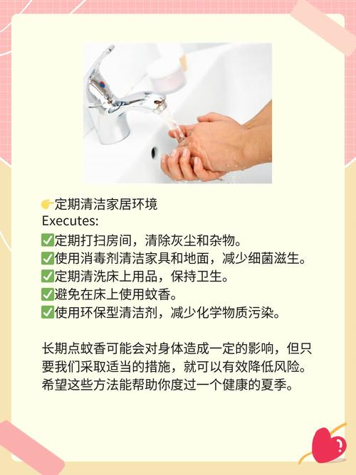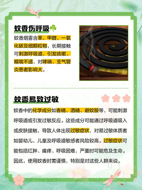 长期点蚊香容易引发呼吸道疾病,如咳嗽、气喘、胸闷等。特别是对于儿童、老人和患有呼吸系统疾病的人群来说,这种危害更为显著。建议 为了减少蚊香对健康的危害,建议在使用蚊香时注意通风换气,避免长时间密闭使用。同时,也可以考虑使用其他更安全、环保的驱蚊方法,如使用蚊帐、电蚊拍等。