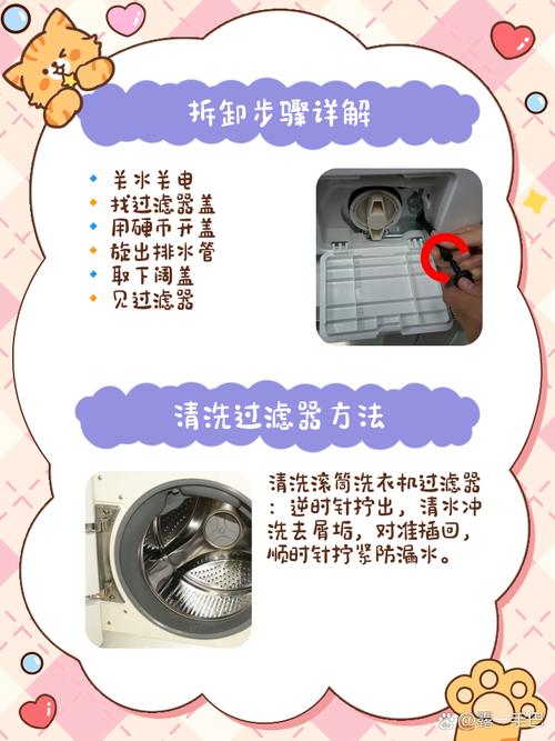 〖Four〗、关闭电源:首先,确保洗衣机已经断电,并拔掉电源插头以确保安全 。打开前面板:在洗衣机顶部找到一个小的开关或按钮,按下即可打开前面板 。定位过滤网抽屉:在打开的前面板下方,可以看到一个类似于小门的结构,这就是过滤网所在的位置 。