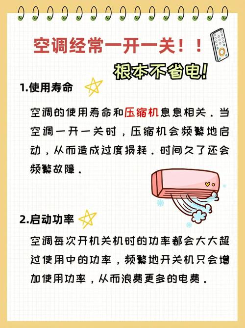 结论:空调「一直开」比「反复开关」更省电。空调在启动时压缩机会以最大功率工作,瞬间耗电量可达正常运行的5『8』倍。若是短时间关空调(例如1小时内重启),压缩机反复重启消耗的电量反而会比维持运行更多。例如在夏季35℃时,将26℃空调关闭半小时后重启降温,比持续运行多耗电约15%。