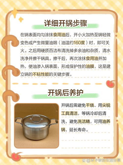 〖One〗、铁锅:可以使用植物油,像花生油,也能用猪油开锅。先把锅洗净擦干,大火烧蓝后冷却至微热,用厨房纸蘸油均匀涂抹在内壁;还可以在小火时用带皮肥猪肉擦锅。不锈钢锅:首次使用前,将白醋和水按1:1的比例混合后在锅中煮沸5分钟,然后倒掉。之后涂抹黄油、橄榄油等食用油进行养护。电热锅:把锅擦干后,在锅内均匀涂抹一层薄薄的常见植物油即可。