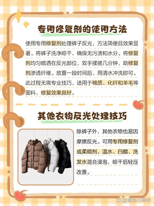 〖Two〗、最简单处理裤子发亮不用熨斗的方法是使用醋和水的混合溶液。具体操作如下:准备溶液:将醋和水按一定比例混合。喷洒溶液:将混合好的溶液装入喷雾瓶中,均匀喷洒在裤子发亮的地方。自然晾干:等待裤子自然晾干,发亮的部分会有所改善,使裤子整体颜色更加统一。