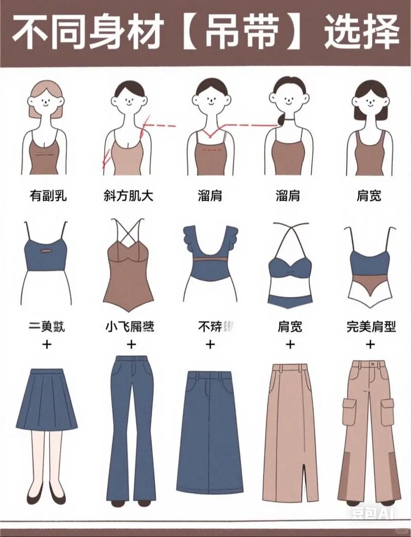 梨形身材女生梨形身材的女生的臀部和大腿部分比较丰满,腰部以下比较宽,选取不当的吊带裙款式容易凸显下半身的缺点。因此,在挑选吊带裙时需要注意以下几个方面:避免过于紧身的吊带裙:过于紧身的吊带裙会凸显下半身的曲线,导致上下身比例失衡。