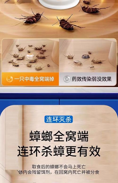 在家里出现蟑螂时,我们通常会使用杀蟑胶饵来处理。这种胶饵具有强大的引诱力,可以吸引蟑螂从远方赶来。我们将胶饵点在蟑螂经常出现的地方以及家中的阴暗、潮湿处。当蟑螂吃了胶饵后,不会马上死亡,而是会返回巢穴,中毒发作后死在巢穴中。