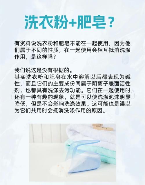 〖Two〗、洗衣粉和肥皂不建议混用。洗衣粉的主要成分是表面活性剂、纯碱、三聚磷酸钠等,呈碱性;肥皂的主要成分是脂肪酸钠盐,也是碱性。两者混用可能会发生化学反应,降低洗涤效果。碱性增强可能会对衣物纤维造成损伤,尤其是一些材质较为娇弱的衣物。