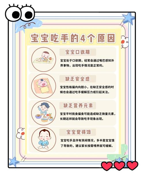 适当引导是关键:虽然吃手是正常现象,但家长仍需适当引导,帮助宝宝养成良好的习惯。例如,可以提供安全的玩具供宝宝抓握,以分散他们的注意力。 关注宝宝的长期习惯:如果到了1岁左右,宝宝依然频繁吃手,家长就需要采取措施了。此时,宝宝已经具备了基本的自我控制能力,应该逐渐减少吃手的习惯。