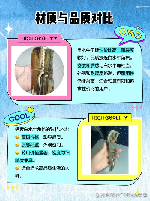 〖Four〗、牛角梳比较好的材质是白水牛角,其次是牦牛角,再次是黄牛角和黑水牛角。购买牛角梳时,应考虑个人体质、发质以及牛角梳的材质、长短和厚度。牛角梳的最佳材质 白水牛角:质地温润,是制作牛角梳的上等材料,对防脱生发有很好的效果。牦牛角:同样具有优秀的质地,适合头发稀疏或脱发严重的人群。