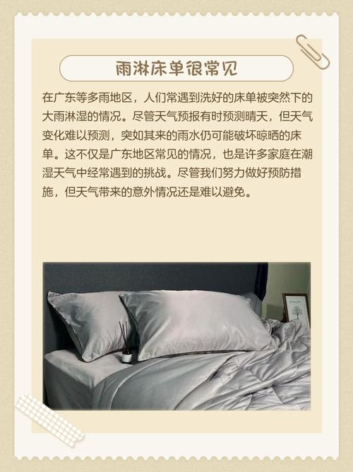 〖Two〗、床单淋了几滴雨,一般情况下不需要立即清洗。但以下情况需要注意:轻微淋湿:如果床单只是淋了几滴雨,并且很快被擦干或晾干,那么通常不需要立即清洗。因为少量的雨水对床单的影响有限,且床单本身的材质也具有一定的抗菌能力。