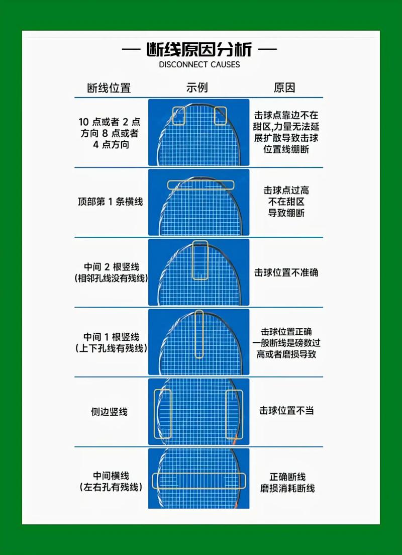 〖Three〗、当发现羽毛球拍断线时,可按以下方法处理。 立即停止使用:一旦发现球拍断线,应马上停止击球,继续使用不仅可能让断线情况恶化,还会影响击球手感与发力,甚至可能导致球拍损坏。 评估断线情况:仔细查看断线位置与数量。