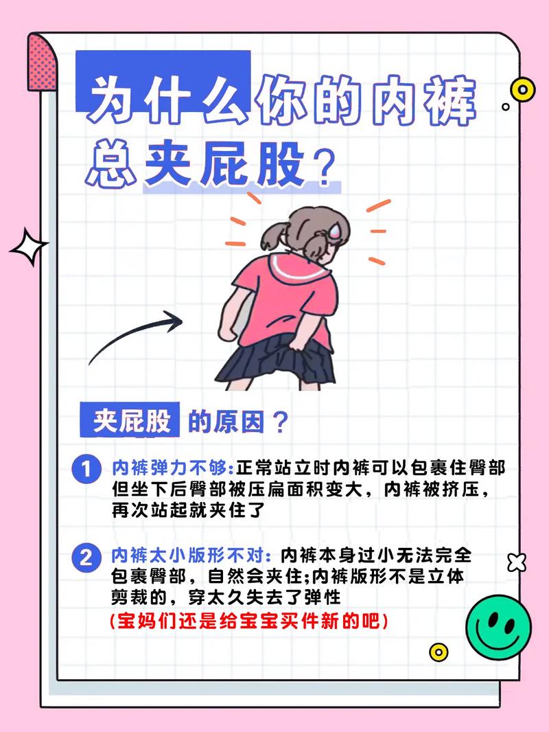 〖One〗、先排除是否内裤不舒服。要尽可能照顾到孩子的心理。后来,我跟几个妈妈聊天时分享了这个原因,他们才开始重视宝宝内裤的舒适度。之前确实很少往这方面想,只觉得是孩子行为习惯的问题,冤枉了孩子。 挑选合适的内裤很重要。一般要先观察自己宝宝的身材,根据身形来选内裤才能有效避免夹屁屁的现象。