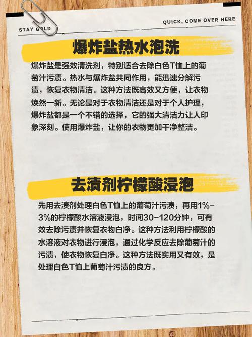 食盐清洗:在污渍上均匀涂少量食盐,轻搓后清水冲洗。消毒液清洗:白色衣物可用专门消毒液,浸泡几分钟污渍通常消失,按说明冲洗晾干。柠檬汁清洗:柠檬汁加清水搅匀,衣服浸泡半小时至一小时,轻搓污渍处后清水冲洗。专业去污剂清洗:用市面上专门去除葡萄汁污渍的产品,按说明使用。