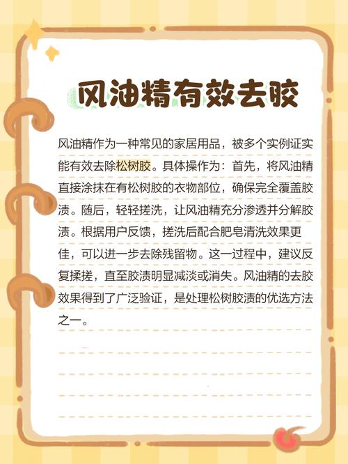 〖Two〗、松胶粘上衣服,可以采取以下几种方法进行清洗:使用丙酮或香蕉水:步骤:将丙酮或香蕉水滴在松胶粘渍上,反复刷洗。效果:待胶渍变软并从织物上脱下后,再用清水漂洗,直至洗净。丙酮的去除效果通常比较好且最快。使用高度白酒或酒精兑水:步骤:将衣物浸泡在高度白酒或酒精兑水中,大约半个小时后搓洗。