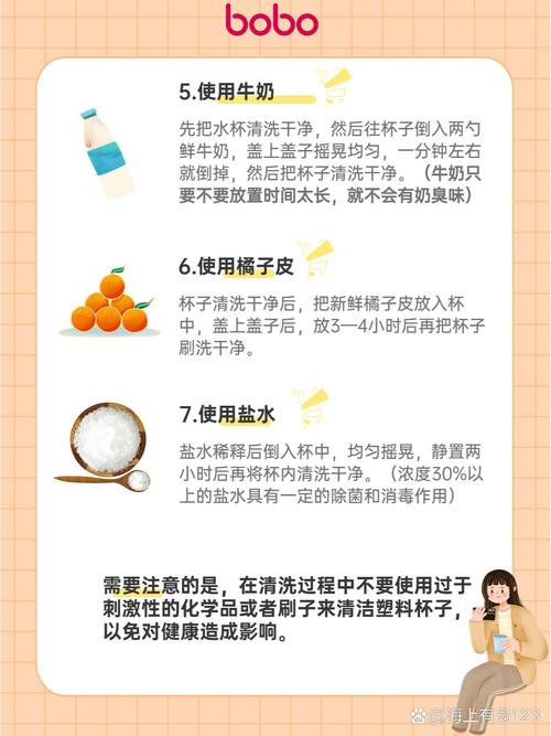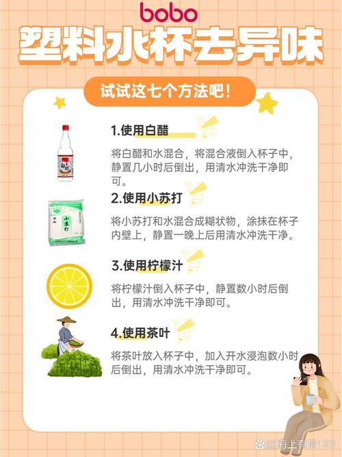 〖One〗、方法一:使用热水去除塑料杯的异味 如果新购买的塑料水杯有异味,可以将水烧开,然后将热水倒入杯中,密封盖紧,浸泡大约10分钟。之后倒掉热水,进行常规清洗。这样能有效减轻塑料杯的异味。 方法二:使用白醋消除塑料杯的异味 先用洗洁精彻底清洗塑料杯,然后在热水中加入适量的白醋进行浸泡和清洗。