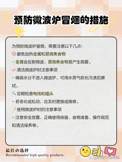 〖Six〗、微波炉上面冒烟可能有多种原因。首先可能是炉腔内有食物过热导致冒烟。比如加热时间过长、功率设置过大等,使得食物局部温度过高,水分快速蒸发甚至碳化,从而产生烟雾。其次,微波炉自身的部件故障也可能引发冒烟情况。