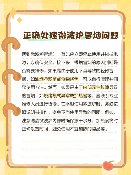 〖Three〗、微波炉冒烟可能是由以下几种原因造成的:油污粘到加热管表面 微波炉在长期加热食物的过程中,内部上方可能会积累很多油污。这些油污可能会粘在加热管(光波管)的表面。当加热管通电加热时,高温会使表面的油污燃烧,从而产生白烟,并伴有刺鼻的气味。