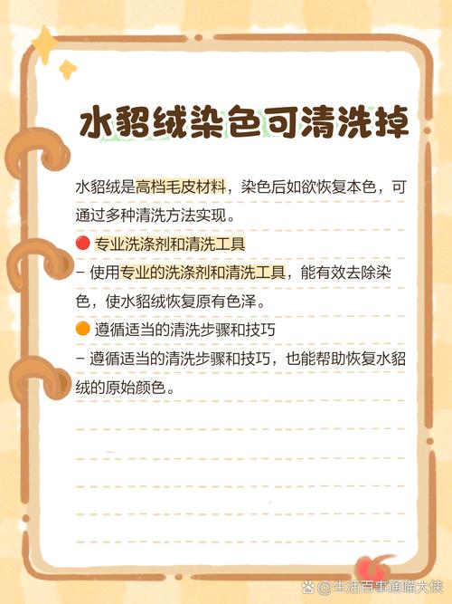 到洗涤店清洗:推荐理由:染色污渍较难处理,且水貂绒材质接近于皮毛,建议到专业的洗涤店清洗,以确保衣物得到妥善处理。自己手洗:操作步骤:在水中加入中性洗涤剂,搅拌均匀后,将染色的仿制水貂绒衣服放入浸泡约15分钟。之后,轻轻搓洗衣物,对于染得不深的颜色,通常可以洗掉。