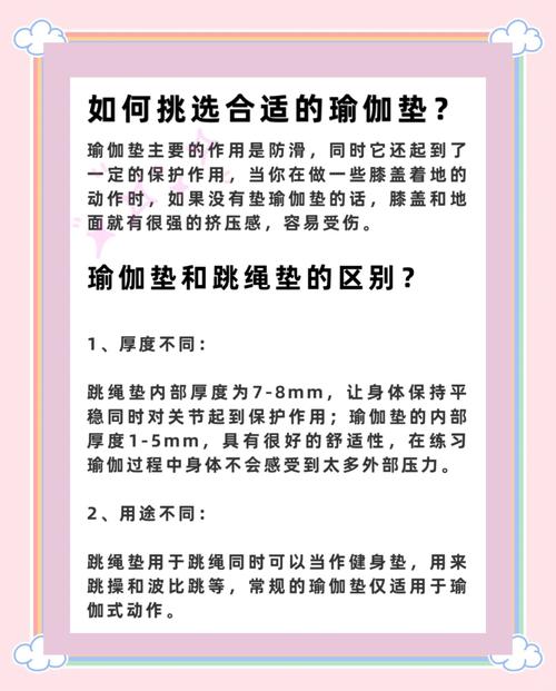 〖Three〗、初学者选购瑜伽垫时,建议从以下几个关键因素综合考虑,以确保舒适性和实用性: 材质选取TPE(热塑性弹性体):轻便、防滑、弹性好,适合初学者,性价比高。环保可回收,但耐用性中等。NBR(丁腈橡胶):厚度大(常达10mm以上),缓冲性好,适合关节敏感者,但防滑性较差,流汗后易打滑。