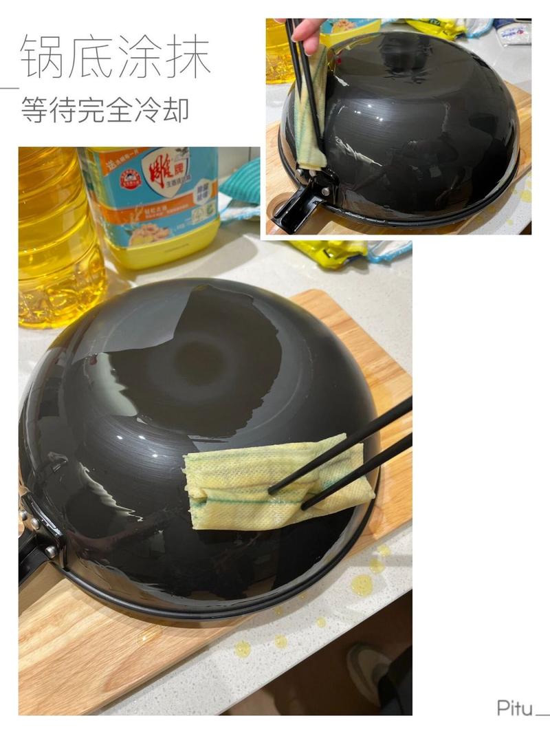 〖Six〗、倒入半锅凉水,盖上盖子。开大火煮沸10分钟,然后倒掉,用洗洁精清洗干净,再擦干水分。锅底倒入适量的食用油,开中火加热至七成热。一边加热,一边转动锅把。让热油粘满锅内壁,放置半天后洗净。如果有时间的话,比较好静置一夜,效果更好。