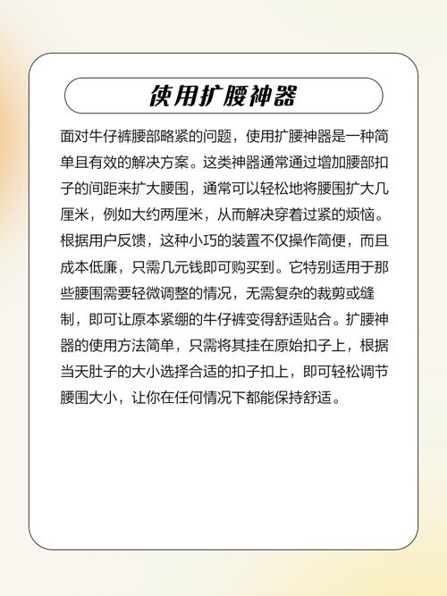 〖Three〗、牛仔裤太紧了,可以采取以下几种方法使其变得稍微宽松一些:物理拉伸法 穿着时适度活动:多穿几次并伴随日常活动,如走路、坐下站起等,牛仔裤会因穿着者的动作而自然拉伸,逐渐变得稍微宽松。