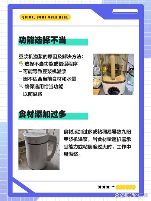 豆浆机出现溢浆情况,原因通常有以下几方面。一是食材用量不当。若放入的豆类等食材过多,超出了豆浆机的合理容量,在豆浆制作过程中,随着豆浆体积膨胀,就容易出现溢浆现象。比如正常一次建议放50克黄豆,若放入80克,就可能引发溢浆。二是水位不合适。