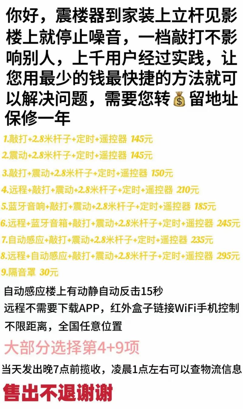 〖Five〗、而且,从道德和法律的角度来看,使用震楼器并不是一个明智的选取。它可能会激化邻里矛盾,对居住环境和社会和谐造成负面影响。同时,销售和使用震楼器可能涉嫌违法,因为这种行为可能侵犯了他人的权益。