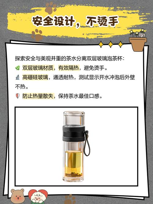 材质选取有讲究:虽然双层玻璃杯可以用来泡茶,但通常建议使用瓷杯或紫砂来冲茶,这些材质能更好地展现茶的香气和口感。当然,玻璃杯也是一个不错的选取,但应避免使用塑料杯,因为塑料可能会在高温下释放有害物质。