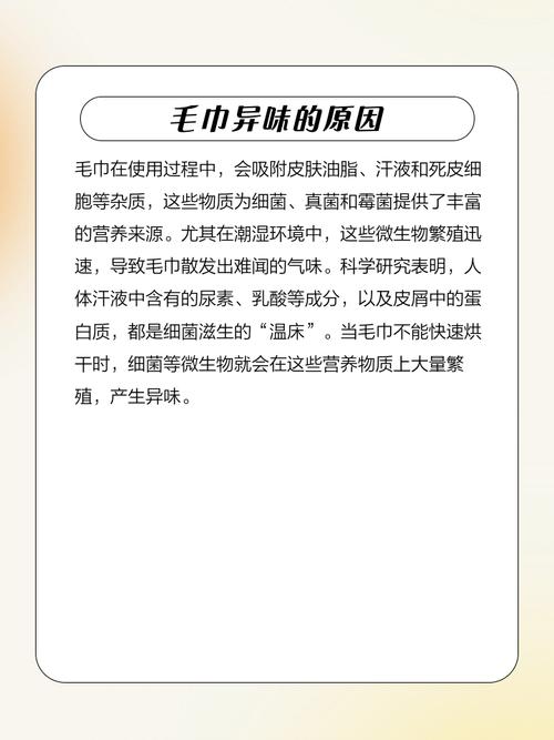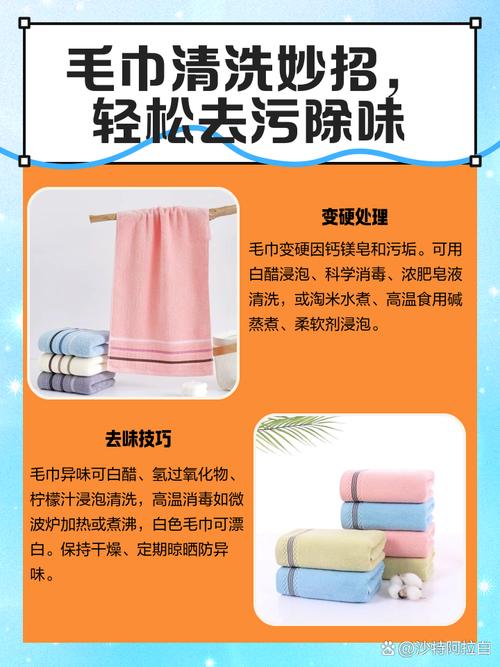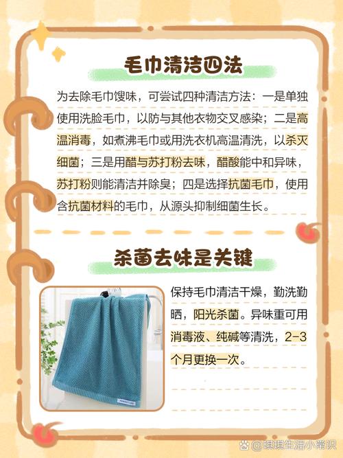 〖Two〗、要去除毛巾的异味,可以采取以下几种方法:高温煮洗:将毛巾放入沸水中煮10『1』5分钟,高温可以有效杀灭细菌,减少异味来源。煮完后用清水冲洗干净并晾干。白醋浸泡:将毛巾浸泡在稀释的白醋水中(白醋与水比例约为1:3),静置30分钟后用清水洗净。白醋具有抗菌和去味的作用。
