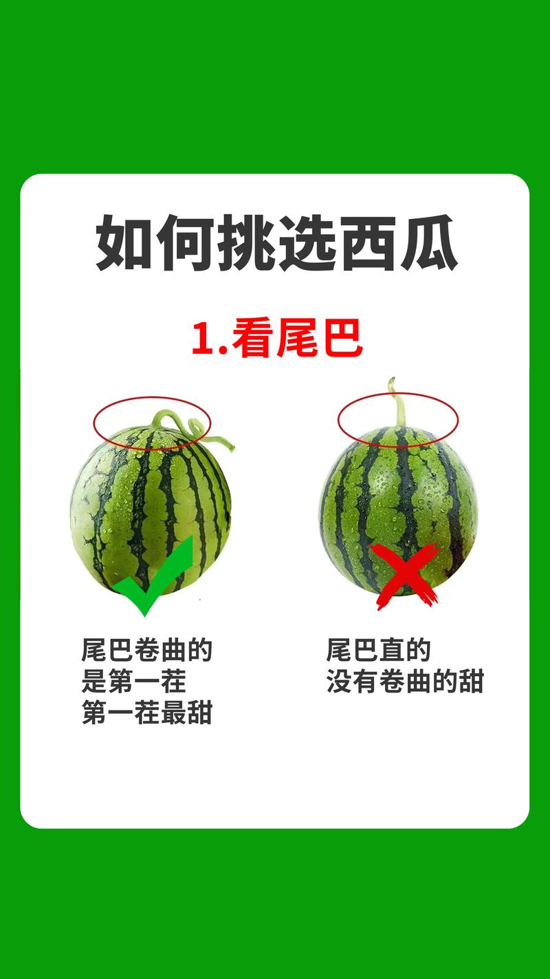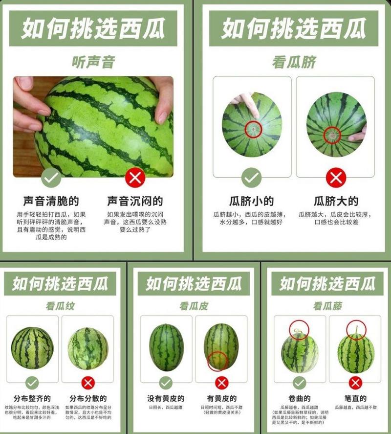〖Three〗、挑西瓜有5个必须牢记的诀窍。一看外观:要选取表皮光滑、纹路清晰且均匀的西瓜。瓜脐部分向内凹陷,且凹陷处越小越甜,瓜蒂要是绿色且新鲜,说明西瓜采摘时间不久,较为新鲜。二摸表皮:用手轻轻抚摸西瓜表皮,手感粗糙的西瓜往往口感更好。如果表皮过于光滑,可能成熟度欠佳。