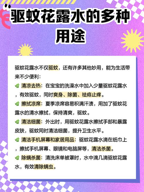 〖Two〗、以下是一些花露水驱蚊小妙招:核心驱蚊用法直接涂抹/喷雾:选取含驱蚊酯、避蚊胺的驱蚊花露水,提前涂抹在手臂、脚踝等裸露皮肤,也可稀释后装入喷瓶喷洒衣物,驱蚊时效可达4 - 6小时。