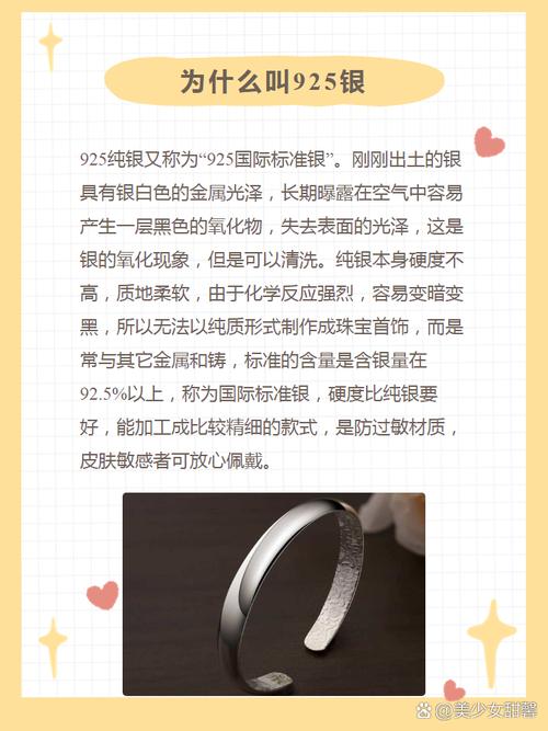 铂金戒指上面有个s925的意思是该戒指的材质为银,且银的纯度为95%。以下是关于S925的详细解释:S的含义:S代表Sterling,即纯银的意思。925的含义:925表示银的纯度为95%,即该银合金中含有95%的纯银,其余5%为其他金属,以增加其硬度和耐磨性。