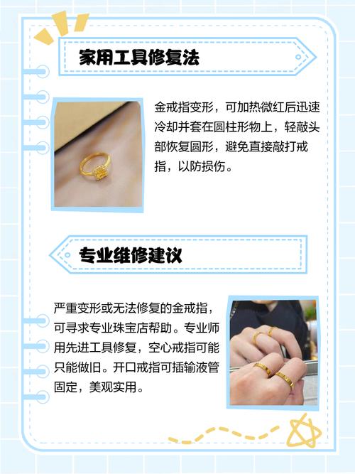 专业珠宝店修复 最直接且安全的方法是将变形的黄金戒指送至专业的珠宝店进行修复。珠宝店拥有专业的设备和技师,能够精准地对戒指进行整形,恢复其原有的形状和美观。尝试自行调整(谨慎操作)对于轻微的变形,如果具备一定的动手能力和对黄金材质的了解,可以尝试自行调整。