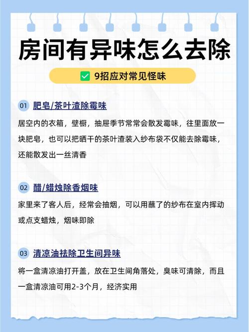 〖One〗、经常通风:确保房间每天至少通风30分钟,这有助于将室内异味排出,引入新鲜空气。 使用空气清新剂:选取合适的空气清新剂,如薄荷、柠檬或薰衣草香味,可以有效覆盖并减少房间内的怪味。 清洁地面和家具:定期使用适当的清洁剂擦拭地板、家具表面,可以去除残留的污渍和异味。