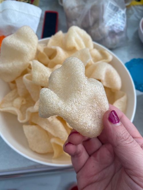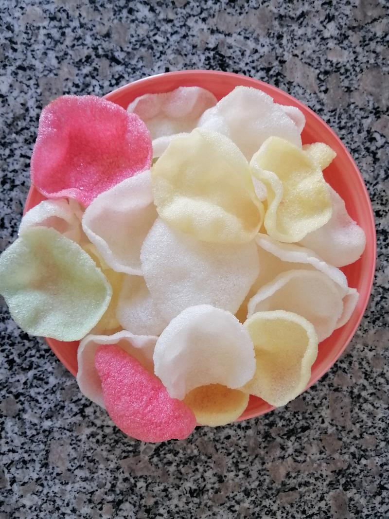 〖Two〗、木薯淀粉:最常见,使虾片酥脆蓬松。其他淀粉:如马铃薯粉、玉米淀粉等,可能混合使用。 调味料:盐、糖、味精、虾味香精、辣椒粉等(根据口味调整)。 膨松剂:如小苏打,帮助油炸或烘烤时膨胀。 水分与油脂:少量水混合原料,油炸时吸油形成酥脆质地。