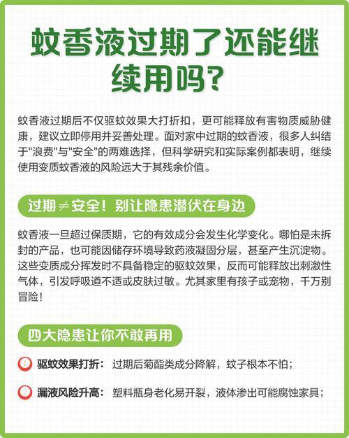 蚊香液隔年如果未过期还有效果,可以继续使用,且没有毒性。以下是具体分析:蚊香液的保质期 蚊香液的保质期通常是两年,但具体保质期可能因品牌和制造商而异。在购买蚊香液时,应仔细检查包装上的保质期信息。如果蚊香液在隔年后仍在保质期内,那么它仍然具有驱蚊效果。