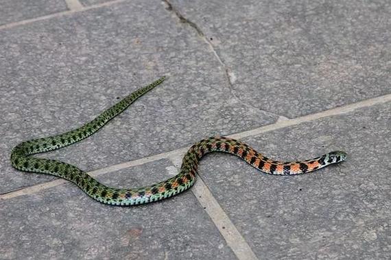 您好,这是:虎斑颈槽蛇,又叫虎斑游蛇、野鸡脖子,属于游蛇科、颈槽蛇属,体长约0.8米左右。体重一般为200~400克。颈背有一明显颈槽,枕两侧有一对粗大的黑色斑块。背面翠绿色或草绿色,有方形黑斑,颈部及其后一段距离的黑斑之间为鲜红色;腹面为淡黄绿色。下唇和颈侧为白色。