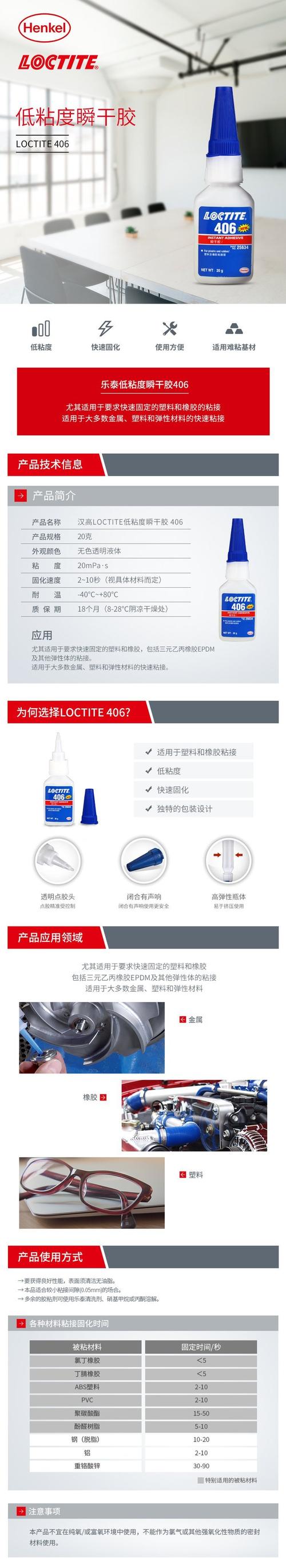 〖Two〗、低粘度、通用型、渗透性好。具有快速固化的作用。特别适用于难粘接材料的粘接。典型用途快速粘接大多数金属、塑料或弹性体材料的自粘和相互快速黏接。用于粘接多孔,酸性及吸收材料,尤其适用于要求快速固定的塑料或橡胶(EPDM)的粘接。特性:一般情况下,材料表面的湿气会引发406胶水的固化。