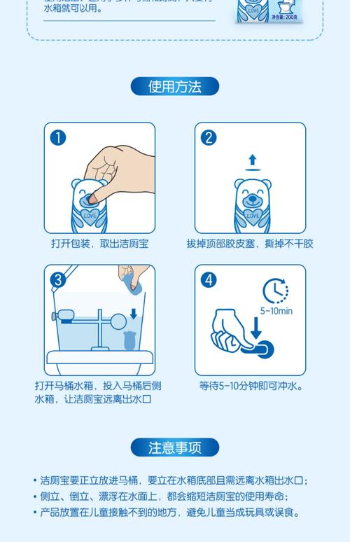 放置洁厕灵:将打开包装的洁厕灵放置在马桶水箱内,特别注意不要压到进水口,以防造成堵塞。固体洁厕灵应放在水箱的浮球下面,在右前角的地方,远离出水口,以便清洁剂慢慢溶解在水中。等待并冲水:让洁厕灵在水中浸泡一会,首次使用时建议静置至少10分钟,以确保清洁剂充分溶解。