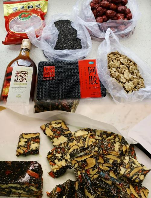 〖Three〗、阿胶糕则是由阿胶为主料,配以黄酒、黑芝麻、核桃仁、红枣、冰糖等辅料制作而成的。具体制作方法包括将阿胶用黄酒浸泡至烊化,将辅料炒香待用,然后将烊化好的阿胶和冰糖倒入锅中小火慢熬,熬至阿胶液粘稠后迅速倒入辅料搅拌均匀,最后倒入涂抹了食用油的保鲜盒中,待凉透后切成小块即可食用。