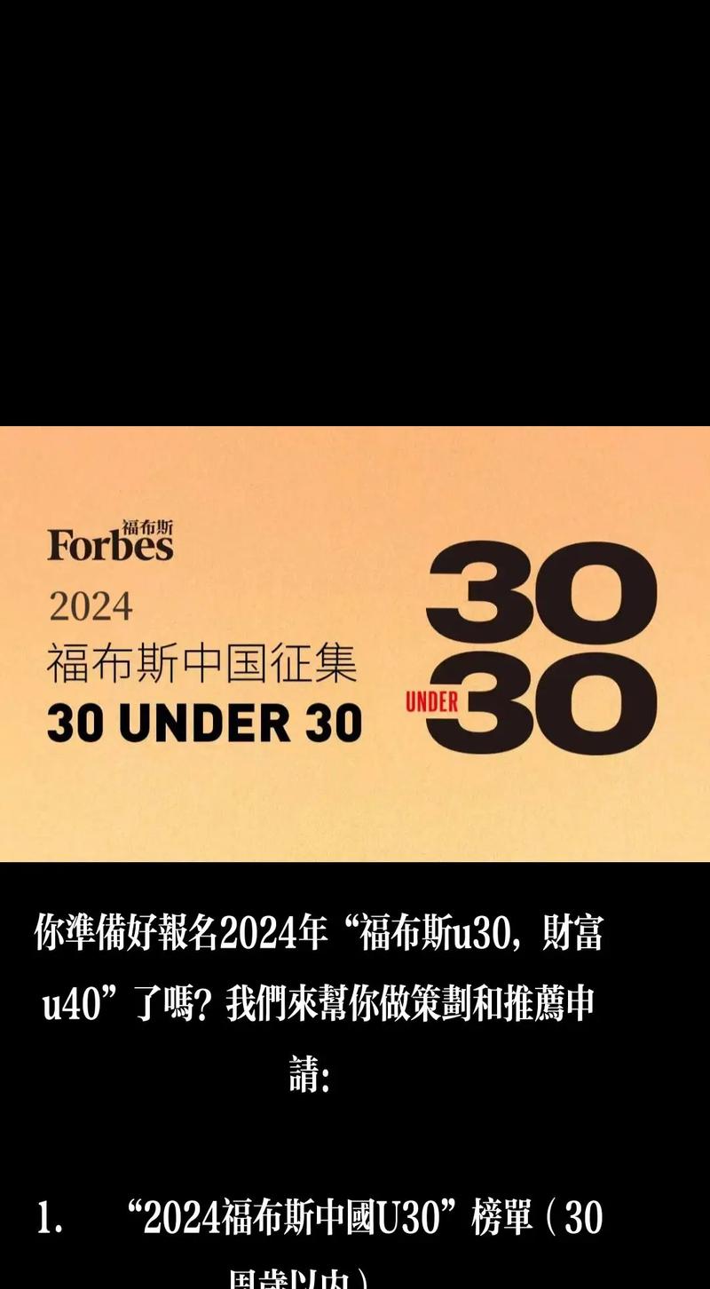 福布斯u30是福布斯30岁以下精英榜。以下是关于福布斯u30的详细解释:榜单定义:福布斯u30,全称为福布斯30岁以下精英榜,是福布斯推出的一项针对30岁以下年轻人的精英榜单。该榜单旨在表彰在各个领域展现出卓越才能和领导力的年轻人。上榜条件:上榜者通常需要满足一定的年龄条件,例如1991年1月1日以后出生。