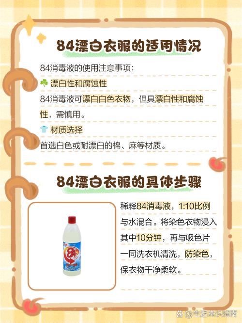 〖Four〗、对于普通衣物,使用84消毒液时,建议每升水中加入约5毫升的消毒液。若衣物污渍严重或数量较多,可适当增加用量,但建议不超过每升水10毫升的用量。具体用量还需考虑衣物的材质、颜色以及个人喜好等因素。为避免不必要的褪色或损坏,建议先在不显眼部分进行小范围测试。
