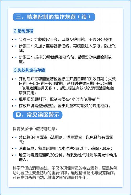 〖Two〗、消毒液的正确配比及方法正确配比我们可以将84消毒液和水按照1:99的比例混合。也就是说,每1升84消毒液需要加入99升的水。注意,一定要按照正确的比例来配制消毒液,否则会影响消毒效果。 白色织物消毒: 我们可以将衣物放入配比好的84消毒水中,浸泡30分钟后,用清水反复冲洗。