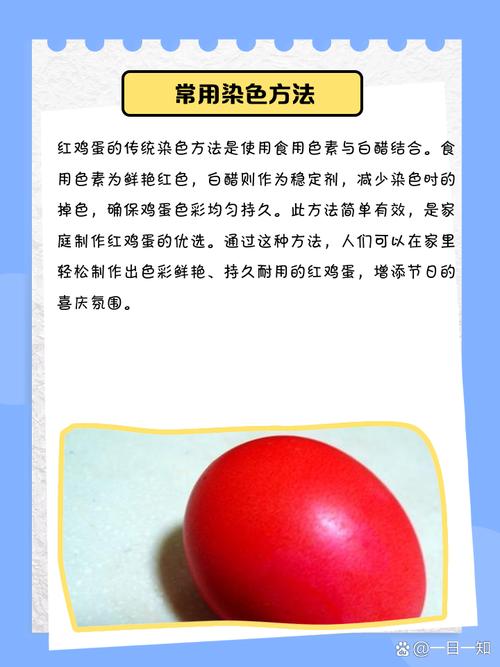 〖One〗、红色纸张染色:红色纸张专门用于染红鸡蛋,颜色容易脱落。煮熟鸡蛋后,用红色纸张轻轻擦拭鸡蛋表面,即可简单染红鸡蛋。这种方法适合染少量鸡蛋。 红色纸张包裹:将红色纸张裁剪成合适大小,紧包在生鸡蛋上,然后放入锅中煮熟。鸡蛋冷却后,剥去纸张,鸡蛋便染上了红色。