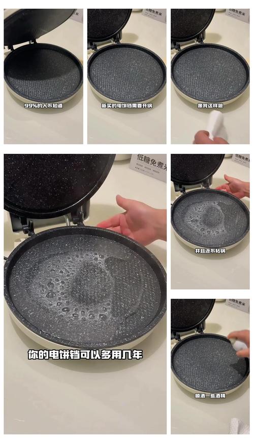 开锅步骤: 预热刷油:将新购买的电饼铛插上电源,打开开关进行预热。预热后,用刷子在电饼铛内部均匀刷上一层食用油。 肥肉擦拭:或者,你也可以选取将一块肥肉放在预热后的电饼铛上,用筷子将肥肉压在电饼铛上并不断摩擦,确保肥肉擦拭到电饼铛内壁的每一个地方。