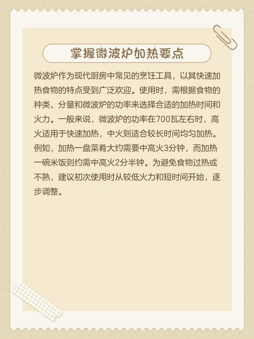 公司带饭用微波炉加热,需根据食材类型、分量和微波炉功率调整,核心原则是中高火2『5』分钟,兼顾均匀性与安全性。